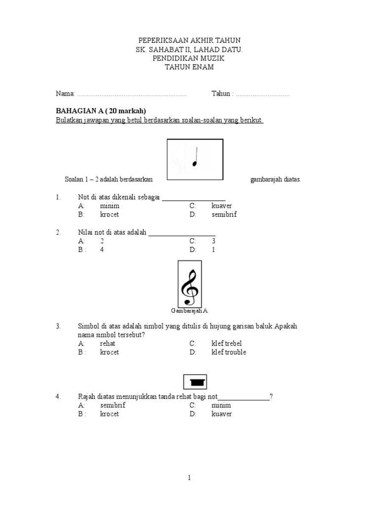 Peperiksaan akhir tahun november 2017 pendidikan muzik tahun 6. Pilih jawapan yang betul bagi soalan berikut.